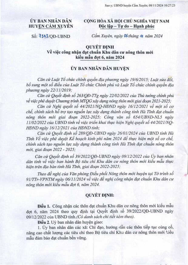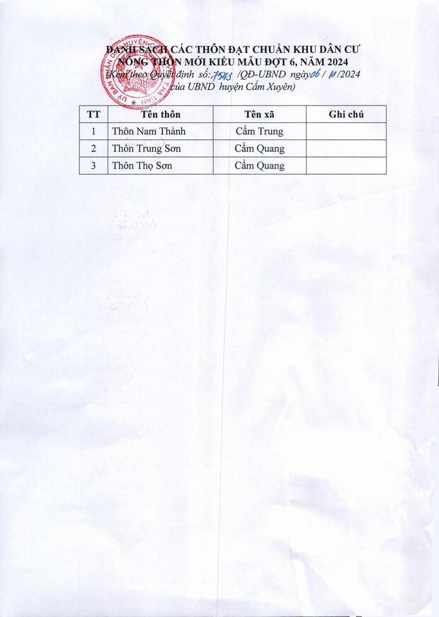 Trao tặng hệ thống thùng rác bảo vệ môi trường cho thôn Trung Sơn Với những kết quả đạt được, ngày 6/11/2024 Thôn Trung Sơn, xã Cẩm Quang, huyện Cẩm Xuyên được UBND huyện Cẩm Xuyên quyết định công nhận hoàn các tiêu chí xây dựng Khu dân cư Nông thôn mới kiểu mẫu năm 2024 theo Quyết định số 7543-QĐ/UBND ngày 6/11/2024.