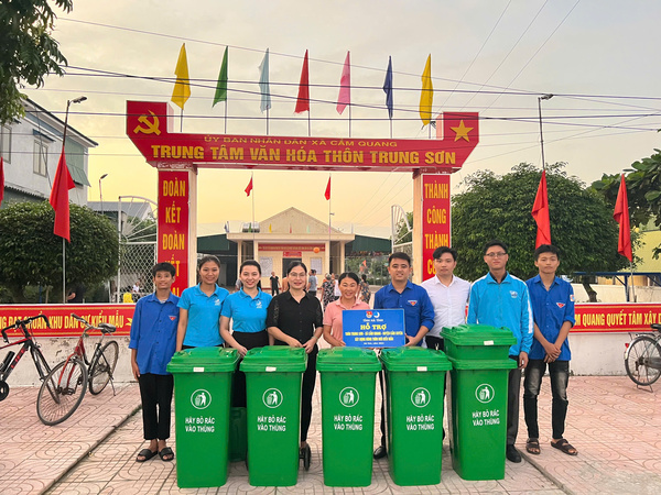 Hỗ trợ nguồn lực triển khai mô hình " Hành trình thứ II của lốp xe" tại nhà văn hóa thông Tiêu biểu, hưởng ứng, Ngày Chủ nhật xanh lần thứ III - Cao điểm nông thôn mới, chung tay xây dựng cảnh quan và bảo vệ môi trường nông thôn, Đoàn công tác Tỉnh đoàn đã trao tặng hệ thống thùng rác bảo vệ môi trường.