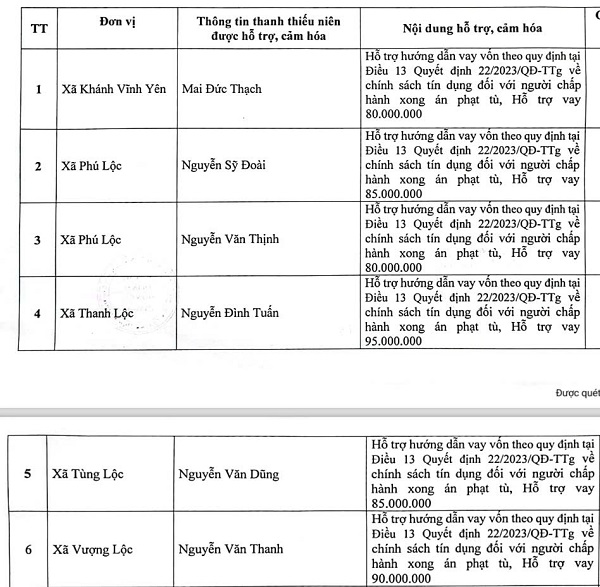 Trong năm 2024, BTV huyện đoàn đã phối hợp với Công an huyện và Ngân hàng chính sách xã hội huyện khảo sát và cho 6 thanh niên vừa hết án tù vay theo quy định tại Điều 13 Quyết định 22/2023/QĐ-TTg về chính sách tín dụng đối với người chấp hành xong án phạt tù, với số tiền từ 80.000.000 đến 95.000.000 triệu đồng.