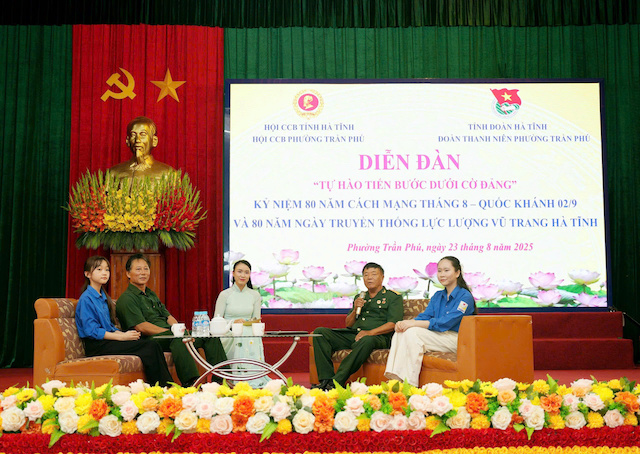 Chào mừng Kỷ niệm 80 năm Cách mạng Tháng Tám và Quốc khánh 02/9 (1945 - 2025), 80 năm Ngày truyền thống Lực lượng vũ trang Hà Tĩnh (1945 - 2025), sáng ngày 23/8/2025, tại hội trường phường Trần Phú, Ban Thường vụ Tỉnh đoàn phối hợp Hội Cựu Chiến binh tỉnh tổ chức diễn đàn “Tự hào tiến bước dưới cờ Đảng”. Chương trình có sự tham gia phối hợp của Đoàn phường Trần Phú và Hội Cựu chiến binh phường.
