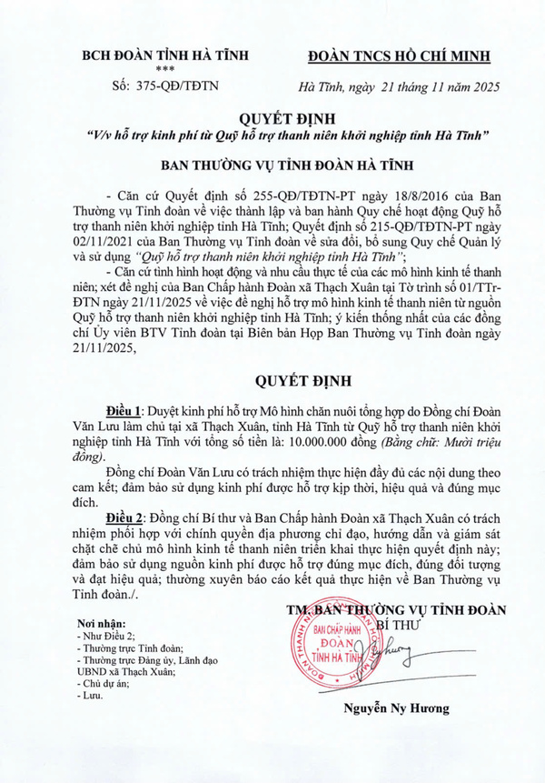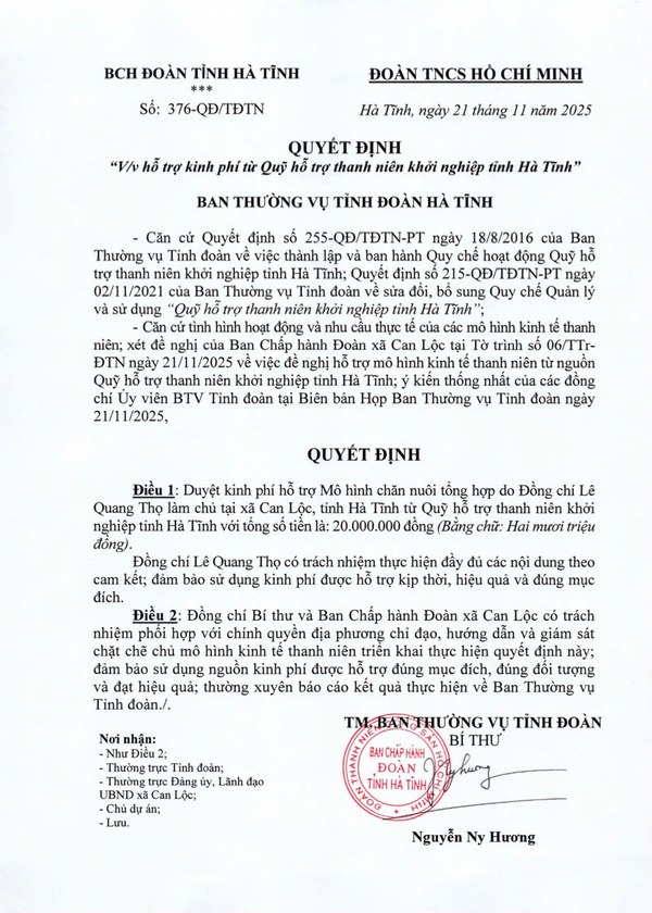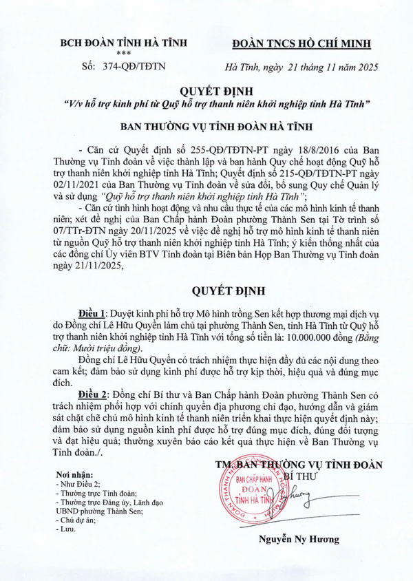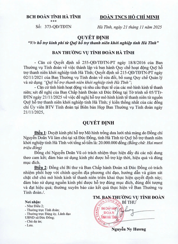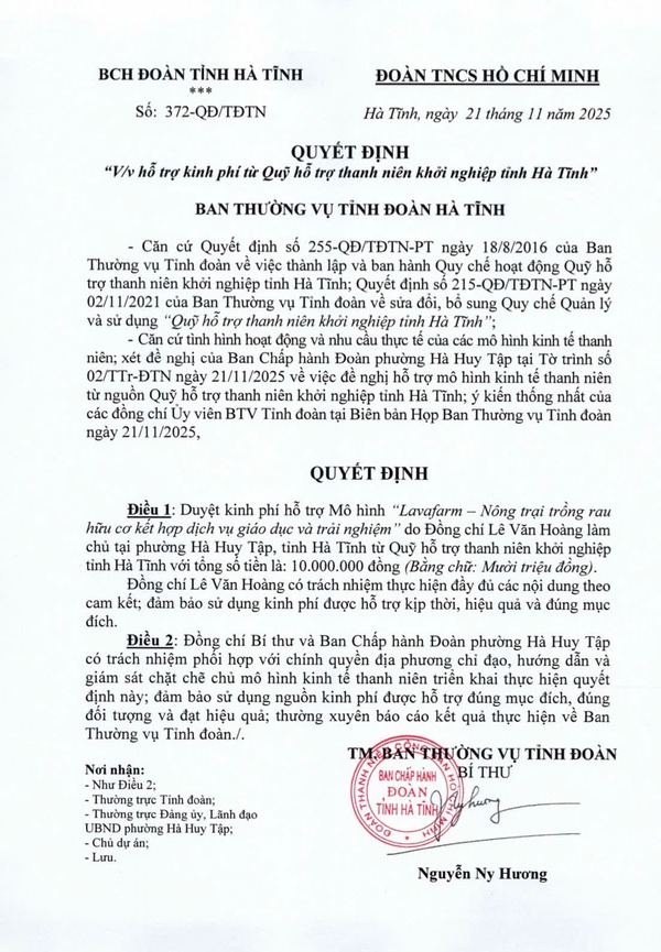 Quyết định số 372-QĐ/TĐTN ngày 21/11/2025 của Ban Thường vụ Tỉnh đoàn về việc hỗ trợ kinh phí từ Quỹ hỗ trợ thanh niên khởi nghiệp tỉnh Hà Tĩnh với số tiền 10 triệu đồng đối với Mô hình “Lavafarm – Nông trại trồng rau hữu cơ kết hợp dịch vụ giáo dục và trải nghiệm” của đồng chí Lê Văn Hoàng. 2. Dự án trồng dưa lưới nhà màng ứng phó với biến đổi khí hậu của đồng chí Nguyễn Doãn Vũ, xã Đức Đồng, tỉnh Hà Tĩnh