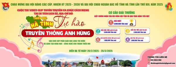 Thiết thực chào mừng chào mừng Đại hội Đảng các cấp nhiệm kỳ 2025 - 2030, Đại hội Cháu ngoan Bác Hồ tỉnh Hà Tĩnh lần thứ XIII, Kỷ niệm 94 năm Ngày thành lập Đoàn TNCSHồ Chí Minh (26/3/1931 - 26/3/2025) và các ngày lễ lớn, sự kiện chính trị quan trọng của tỉnh, của đất nước năm 2025, Ban Thường vụ Tỉnh đoàn, Hội đồng đội tỉnh phát động Cuộc thi video clip tuyên truyền ca khúc Cách mạng tại di tích lịch sử, địa chỉ đỏ với chủ đề “Thiếu nhi Hà Tĩnh tự hào truyền thống Anh hùng” tới các bạn học sinh, đội viên, thiếu nhi đang theo học tại các trường tiểu học, Trung học cơ sở trong toàn tỉnh. Cuộc thi diễn ra từ ngày 20/02/2025 - 26/3/2025 với nhiều giải thưởng hấp dẫn từ Ban Tổ chức.