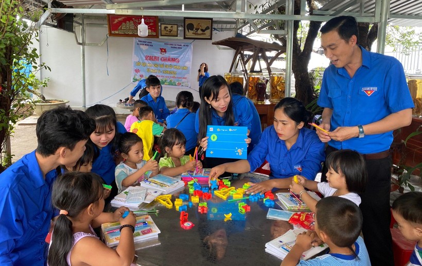 Đoàn viên, thanh niên Trường Đại học Kiên Giang dạy học cho các em học sinh hoàn cảnh khó khăn.