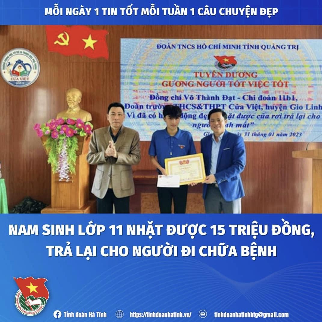 Tỉnh đoàn Quảng Trị ngày 31-1 phối hợp với Ban Giám hiệu, Chi Đoàn Trường THCS & THPT Cửa Việt (thị trấn Cửa Việt, huyện Gio Linh, tỉnh Quảng Trị) tổ chức tuyên dương, khen thưởng nam học sinh khi có nghĩa cử cao đẹp là trả lại 15 triệu đồng cho người mất.