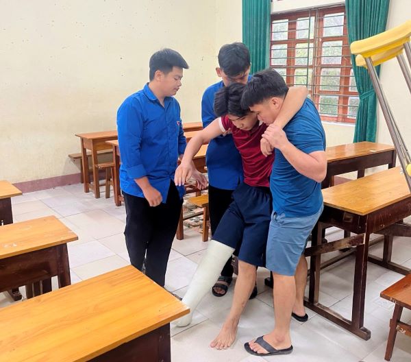 Tại điểm thi trường THPT Nguyễn Đình Liễn, huyện Cẩm Xuyên đội thanh niên tình nguyện hỗ trợ thí sinh bị gãy chân vào phòng thi