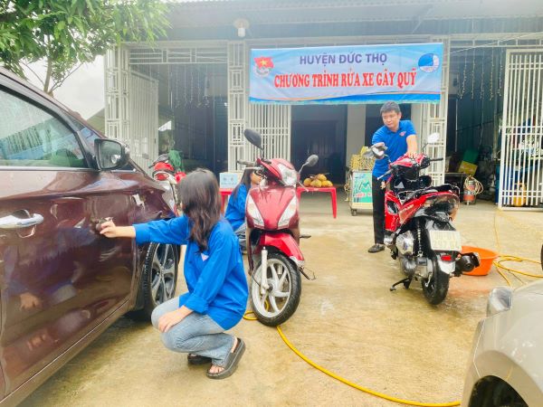 Trước điểm thi trường THPT Trần Phú, Huyện đoàn Đức Thọ tổ chức Chương trình rửa xe gây quỹ hỗ trợ học sinh có hoàn cảnh khó khăn trên địa bàn huyện