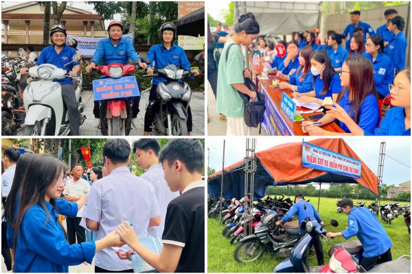 Đội hình thanh niên tình nguyện tại các điểm thi triển khai: điểm giữ đồ, phát quạt, nước uống miễn phí, tổ chức điểm trông giữ xe, thành lập “biệt đội” xe ôm miễn phí sẵn sàng hỗ trợ thí sinh và phụ huynh…